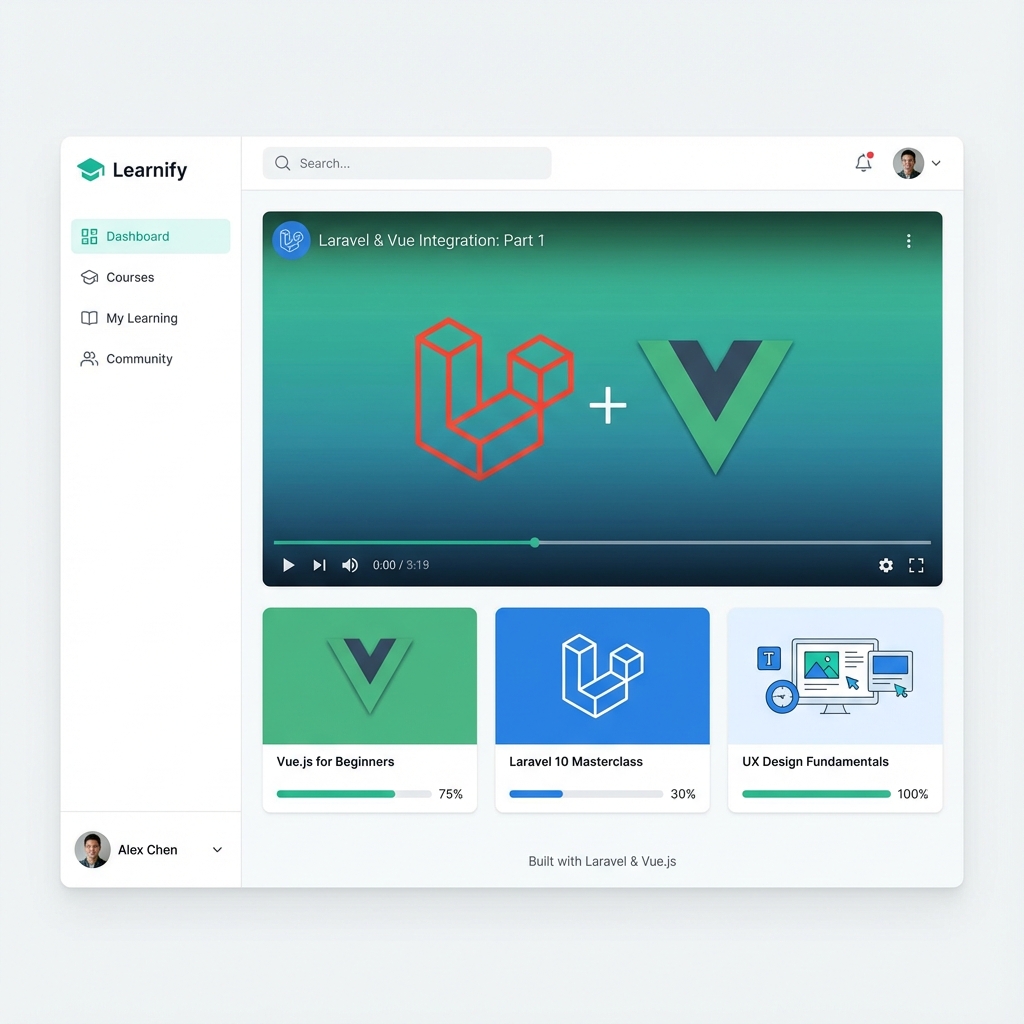 "Build a comprehensive e-learning platform using Vue.js frontend and Laravel backend. Include course management, video streaming, live classes, student progress tracking, certification system, payment processing, and instructor analytics. Use modern PHP patterns and optimize for high traffic."